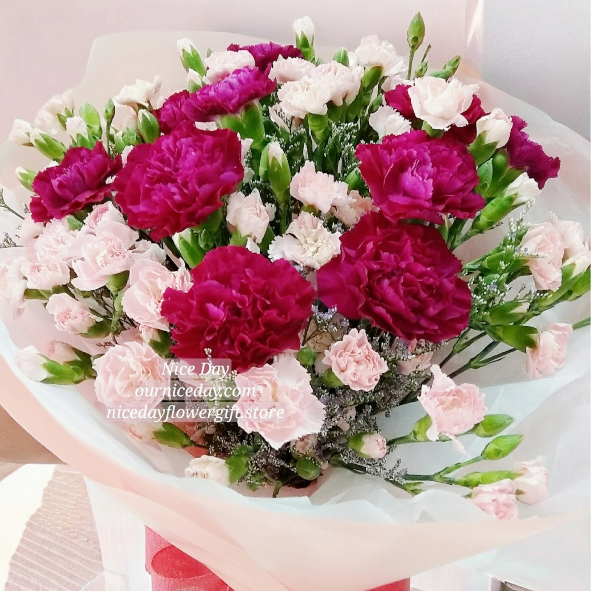 紫及粉色...大大小小的康乃馨花束,好搶眼! ✅送心意卡 ✅圖片只供參考 ***此花束價格不適用於情人節期間 🔻🔻🔻 ✅請使用查詢鍵的whatsapp訂購。 ✅請在系統備註欄務必填寫: 送貨日期,及心意卡資料:上款+心聲+下款 ☆☆☆此商品不適合情人節期間送貨,請與本店聯絡。 🔻🔻🔻 *市區免費送貨* 每天送貨時間由上午9:00至下午5:00。如需指定時間送貨請與我們聯絡(可能收取附加費)。