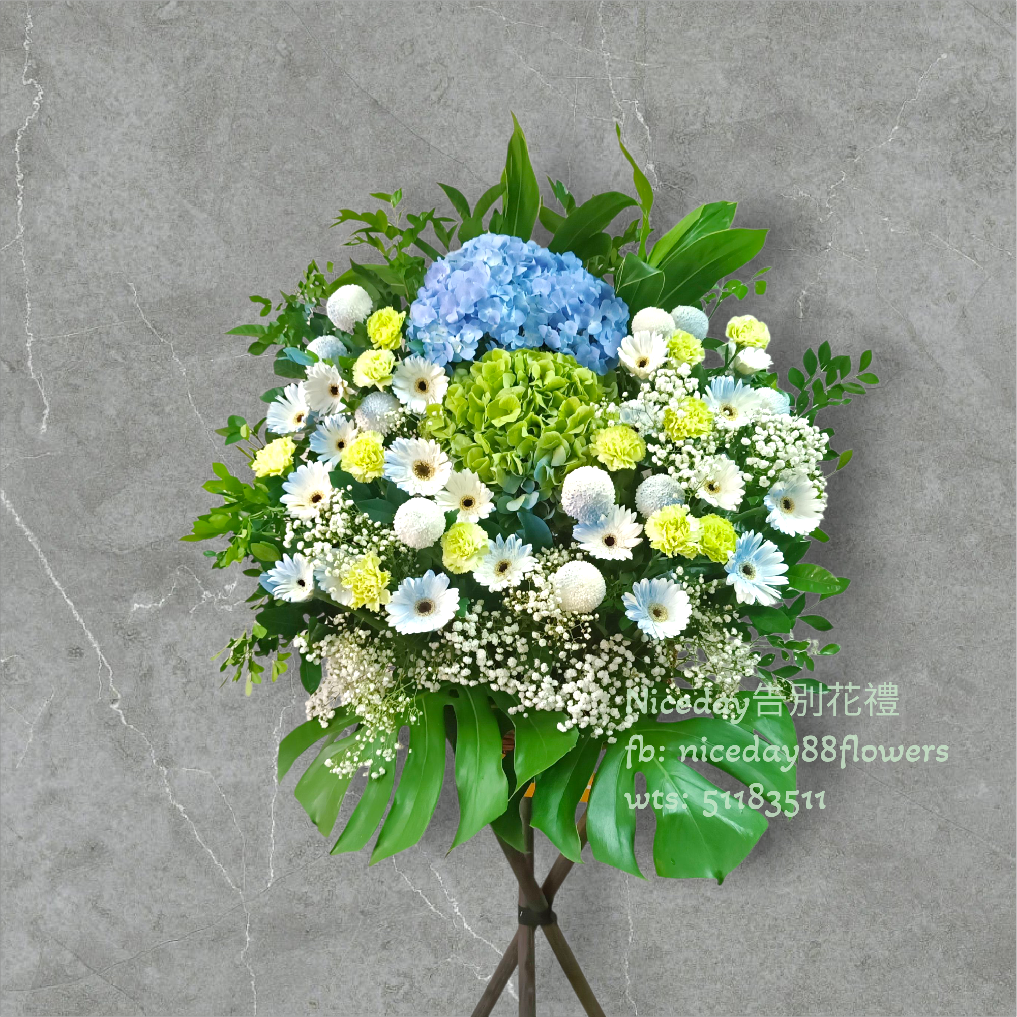 🌿藍綉球、綠綉球、白太陽、滿天星、襯花和綠葉 *三腳木架 *約高6'2" / 188cm *提供A3致意卡 ✅圖片只供參考 🔻🔻🔻 ✅請使用網頁系統訂購,或按查詢鍵的whatsapp訂購。 ✅請在系統備註欄務必填寫: 送貨日期,及心意卡資料:上款+心聲+下款