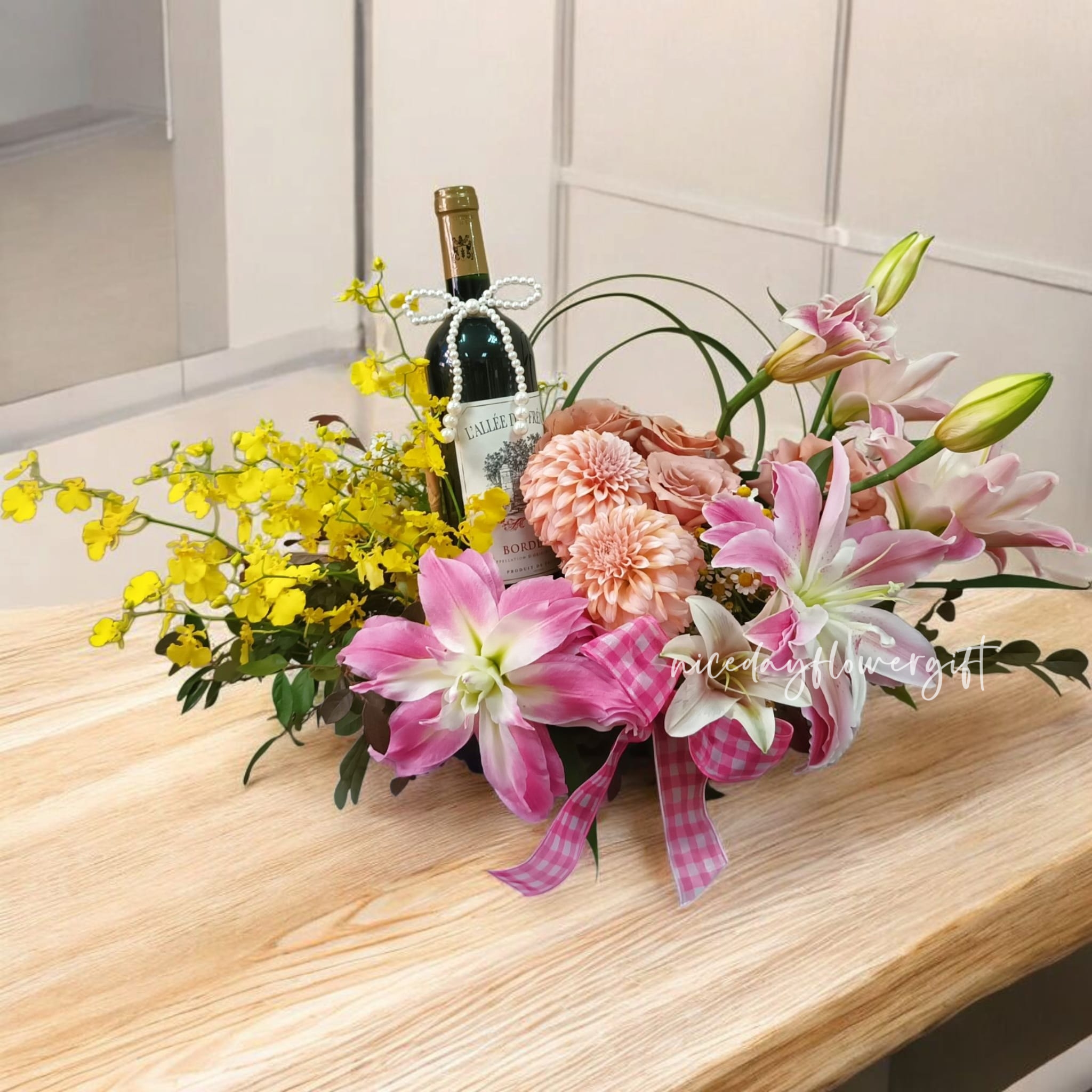 特選紅酒配合美麗的鮮花 送上暖暖的祝福! (圖中產品只供參考,會因應存貨更新產品) *送心意卡 ✅適合生日、問候、紀念、祝賀﹏ ✅圖片只供參考 ***此花束價格不適用於情人節期間 🔻🔻🔻 ✅請使用網頁系統訂購,或按查詢鍵的whatsapp訂購。 ✅請在系統備註欄務必填寫: 送貨日期,及心意卡資料:上款+心聲+下款 🔻🔻🔻 每天送貨時間由上午9:00至下午5:00。如需指定時間送貨請與我們聯絡(可能收取附加費)。