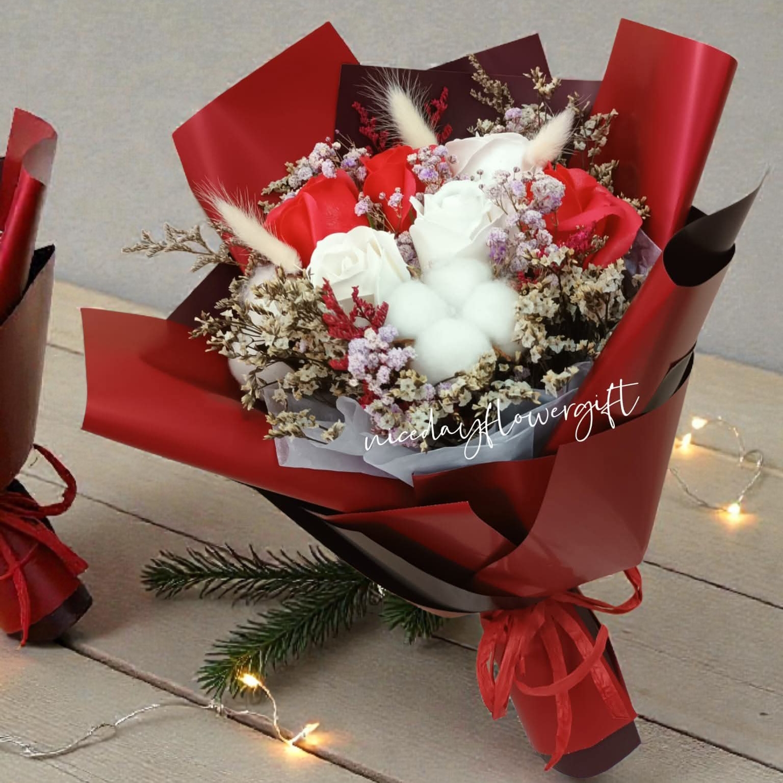 人氣小巧花束...紅色及白色香皂玫瑰各三枝(不是真花),加入棉花及乾花花材;紅色花紙包裝。 (保持清爽,可存放2-3年) ✅附送心意卡 ✅圖片只供參考 ***此花束價格不適用於情人節期間 🔻🔻🔻 ✅請使用網頁系統訂購,或按查詢鍵的whatsapp訂購。 ✅請在系統備註欄務必填寫: 送貨日期,及心意卡資料:上款+心聲+下款 ☆☆☆此商品不適合情人節期間送貨,請與本店聯絡。 🔻🔻🔻 *市區免費送貨* 每天送貨時間由上午9:00至下午5:00。如需指定時間送貨請與我們聯絡(可能收取附加費)。