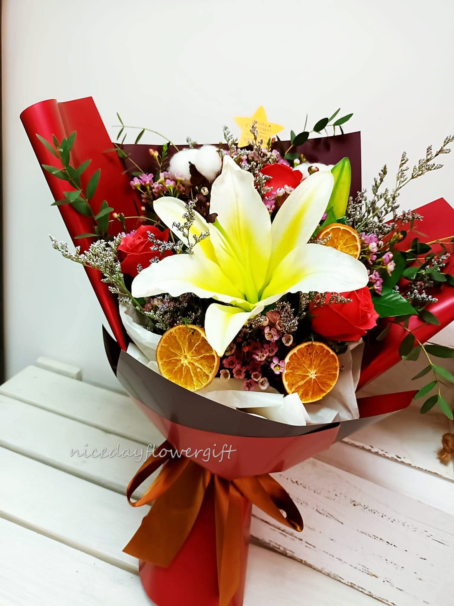 💚雜式花材及乾果 用紅色双面花紙包裝 ✅送心意卡 ✅圖片只供參考 🔻🔻🔻 ✅請使用網頁系統訂購,或按查詢鍵的whatsapp訂購。 ✅請在系統備註欄務必填寫: 送貨日期,及心意卡資料:上款+心聲+下款 ☆☆☆此商品不適合情人節期間送貨,請與本店聯絡。 🔻🔻🔻 每天送貨時間由上午9:00至下午5:00。如需指定時間送貨請與我們聯絡(可能收取附加費)。